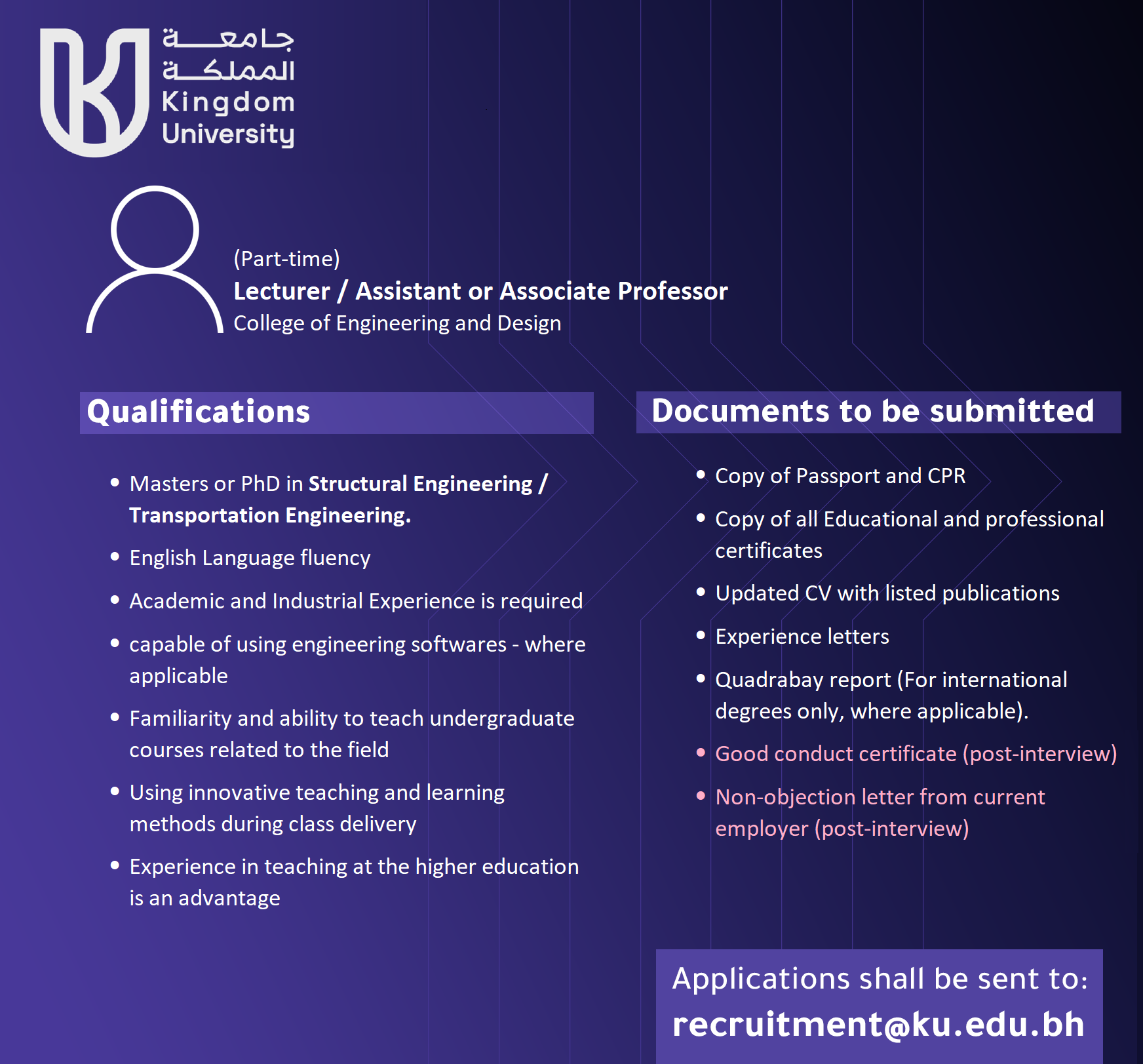 Applications shall be sent to: recruitment@ku.edu.bh