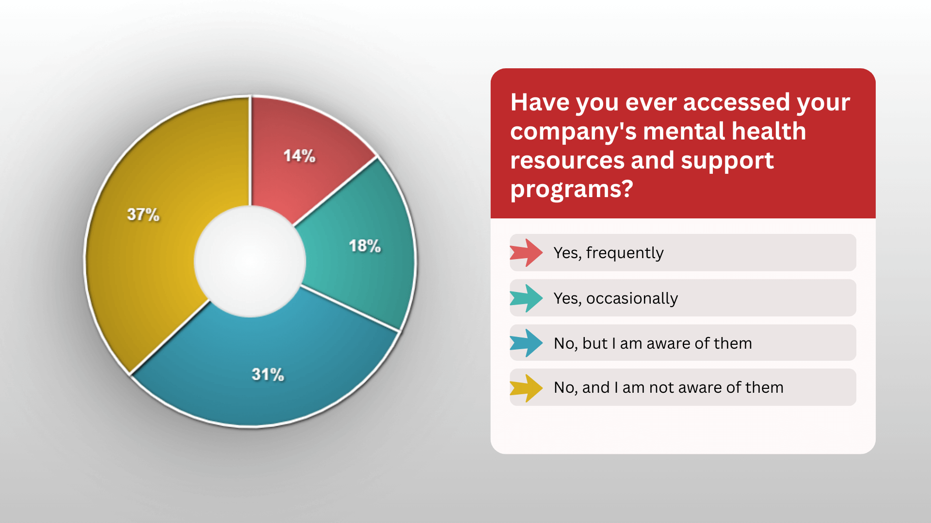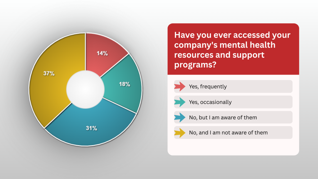 As the chart shows, a staggering 68% of participants have never accessed any of the mental health resources or support programs provided by their companies. Perhaps more concerning is that 37% were not even aware that such support existed. This shows that even when help is available, it often goes unused, placing the responsibility back on the individual to recognize the signs of burnout and seek support.